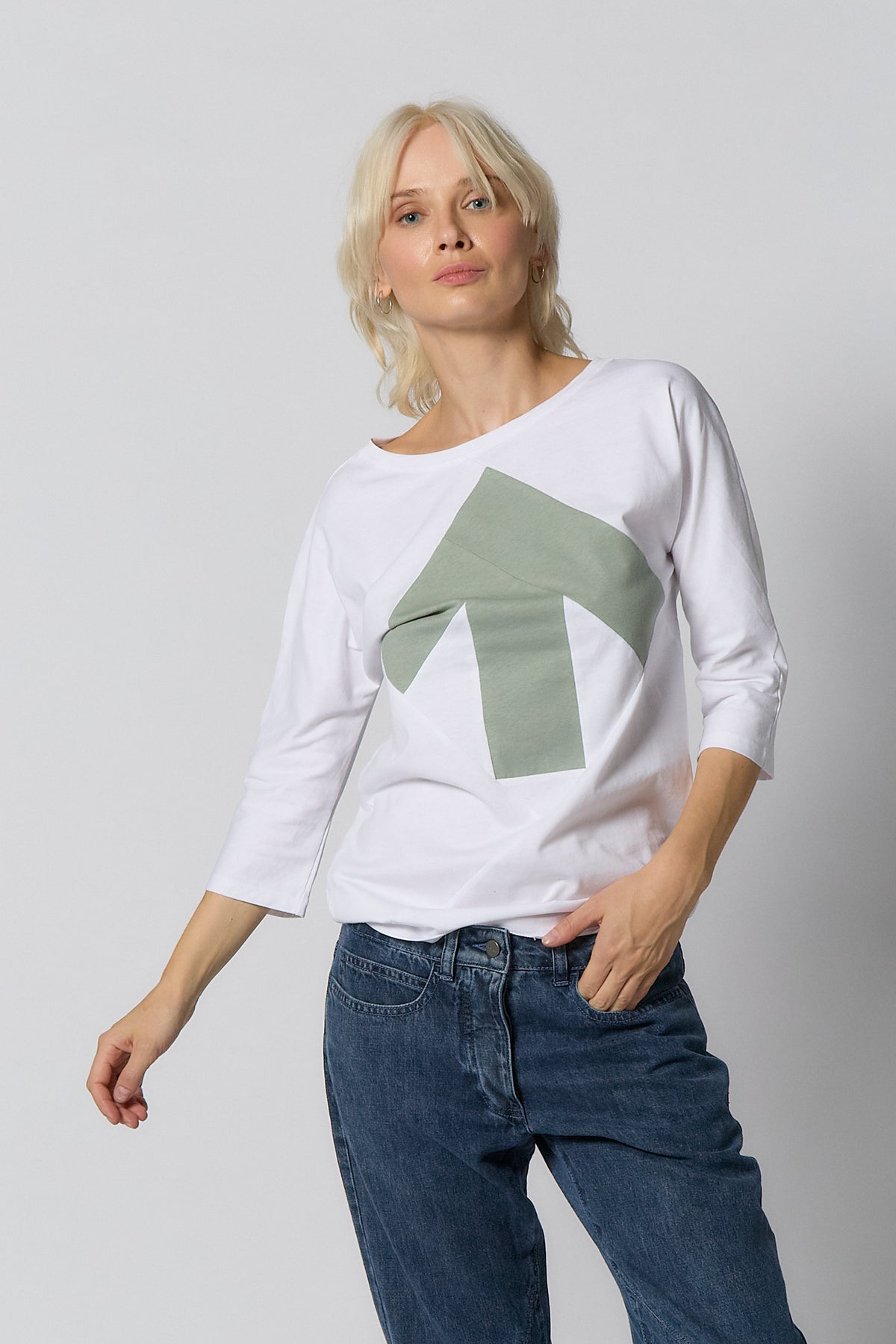 The arrow motif up-shirt is a timeless classic from Reet Aus. The arrow motif is sewn from pieces of leftover fabric from the textile industry.